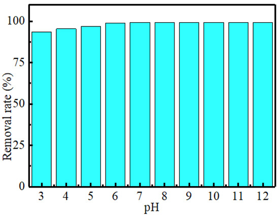 The pH value of the solution is an important factor affecting the adsorption effect [34]. In this paper, the pH range of the solution is adjusted to 3–12 with a certain concentration of concentrated sulfuric acid and sodium hydroxide. It can be seen from Figure 8 that different pH values have little effect on the adsorption effect. The adsorption rate of MoS2 on MB can be maintained at more than 93.47%, indicating that the adsorbent has a wide pH adsorption range. In the local pH range (3–5), the removal rate of MB solution by MoS2 adsorbent decreased slightly. This is because the surface of MoS2 adsorbent has anionic charge, and MB belongs to cationic dye. Therefore, in the strong acid environment, the strong acid may change the charge distribution on the sample surface and affect its adsorption effect [35].