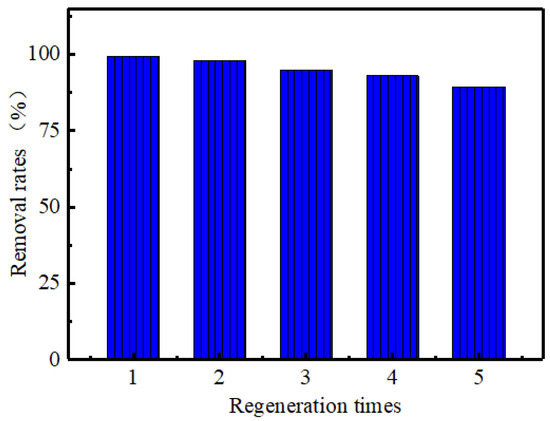 The regeneration and recycling performance of adsorbent is also an important index to evaluate the function of adsorbent [35]. Therefore, it is necessary to study the regeneration and cycle performance of MoS2. In alkaline solution, OH- easily competes with the active adsorption site on the surface of MoS2 to desorb cationic dyes [36]. In this paper, 0.05 mol/L NaOH solution was used as the elution solution to treat the adsorption material [37]. In Figure 9, the removal efficiency of MB by MoS2 for the first time is 99.5%, and the removal efficiency of MB by MoS2 after five cycles is still 89.34%, which indicates that MoS2 adsorbent has good regeneration and recycling performance.
