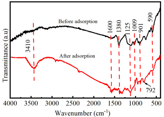 The MoS2 adsorbent before and after adsorption was analyzed by FT-IR spectrum. As shown in Figure 10, the strong peak around 590 cm−1 is the characteristic tensile vibration peak of Mo-S [38,39]. The C-H vibration in the plane is the main reason for the occurrence of new characteristic peaks at 792 cm−1. The peak at 901 cm−1 is caused by C-O vibration. Partial oxidation of MoS2 after contact with air causes an absorption peak at 1009 cm−1 [40]. The displacement of the absorption peak at 1125 cm−1 is caused by the vibrational stretching of the C-O. The peak of 1380 cm−1 is S=O peak, which is also the representative peak of MoS2 [41]. The peak at 1600 cm−1 is caused by O-H tensile vibration and bending vibration caused by partial oxidation of MoS2 after contact with adsorbed water [42,43]. In addition, it can be clearly seen that the peak at 3410 cm−1 after adsorption is enhanced, which indicates that more O-H groups appear on the surface of MoS2 [44].