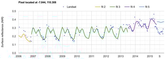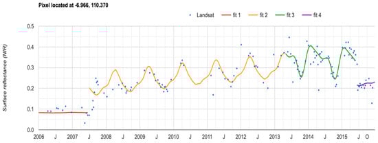 One of the areas that experienced many changes is at the border of the Tugu district and Semarang Barat (West Semarang) where the Jenderal Ahmad Yani International Airport was expanded (Figure 7). CCDC detects changes in the pattern of Surface Reflectance (Near Infrared) over the course of time. Between 2006 and 2015, there were four pattern changes detected at the airport, with those changes occurring in the summer of 2007, in the spring of 2013, and in the summer of 2015 (Figure 8). In 2006, the area the airport would occupy was classified as agriculture. Using Landsat imagery, the land can be seen to be changing from aquaculture to dried land to construction of the airport.