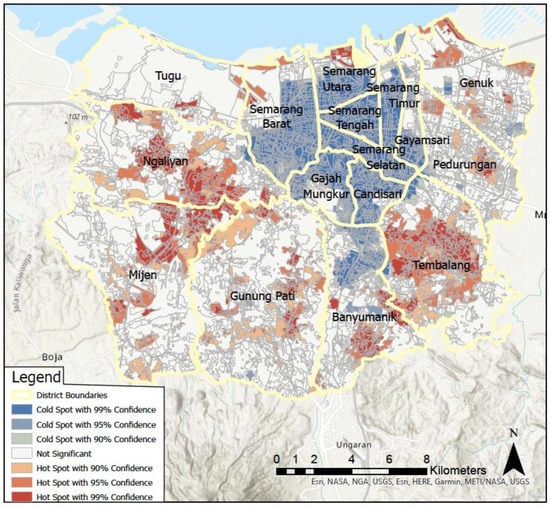 Optimized Hot Spot Analysis of areas likely to experience change in Semarang City, Indonesia. Cold spots can be seen close to the existing city center with hotspots predominantly in neighboring areas experiencing population growth and economic development.