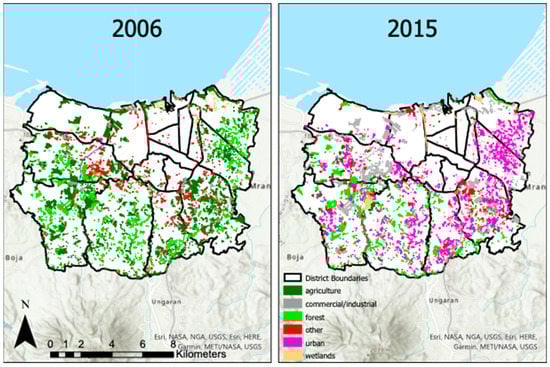 We processed the LULCC datasets and reclassified to identify 17 classes in the two LCLU datasets in 2006 and 2015. However, the original number of classes for change analysis (128, at Level 3) was not feasible, due to the extent of analysis and validation methods using Google Earth imagery []. Hence, we used the six classes shown in Figure 3: agriculture, forest, commercial/industrial, urban, wetlands, and other. Figure 3 shows the land cover of the districts of Semarang City including Central Semarang, Tembalang, and Mijen. Agriculture and forest areas are prominent on the periphery of the city in the south and west, highlighting the desakota framework.