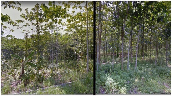 Sample of Rubber Agroforestry (left; location: 7°01′55.5″ S 110°24′23.6″ E) and Rubber Monoculture (right; location: 7°01′12.9″ S 110°19′49.5″ E); images from Google Map Street View collected April 2015 and March 2015, respectively.