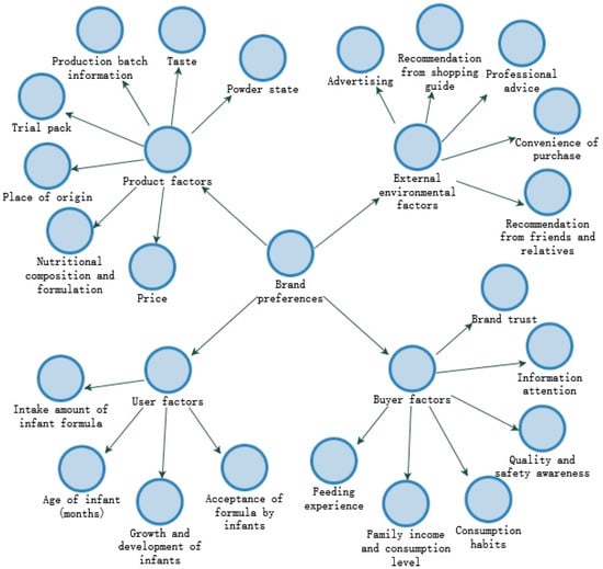 After the free coding of all information, the free nodes were further categorized and merged with concept and theme refinement to form tree nodes with the same conceptual category. Tree nodes can describe the interrelationships between qualitative research concepts. Tree nodes are nodes that have logical relationships with free nodes and deal with the connections between nodes. Based on the tree node connection, the factors influencing consumers’ brand preferences for infant formula were grouped into the following four categories: external environmental factors, product characteristics, buyer factors, and user (babies and infants) factors. The “New Item Map” function of Nvivo12 software was used to build the model, and a visualization of the tree node diagram of the influencing factors was formed (See Figure 1).