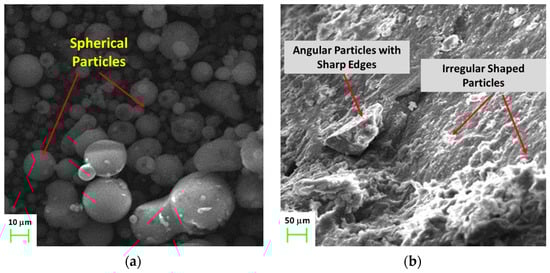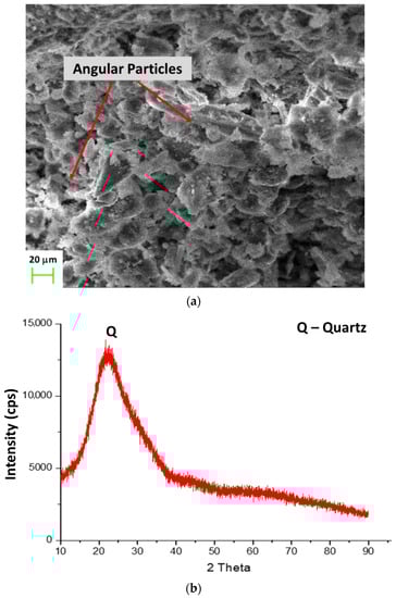 Micro silica or silica fume is a supplementary cementitious material used as an artificial pozzolanic admixture. The average diameter of micro silica is 100 times smaller when compared to the Portland cement, showing its extreme fine characteristics [34]. Moreover, the use of micro silica in concrete could initiate a rapid reaction and thereby help in achieving high early strength. Hence, it can be mentioned that the efficiency of micro silica is 3–5 times higher when compared to the conventional Portland cement. Moreover, the density of silica fume was found to be 1.8 g/cm3. Figure 3a shows the SEM image of micro silica or silica fume. From the microstructure analyses, it can be found that the silica fume contains a large number of angular and irregular particles. From the XRD results of silica fume, it is clear that micro silica is generally amorphous in nature which can be attributed to the surface tension in the phase transition and rapid condensation of volatile SiO2 and Si gases (Figure 3b). But a few sharp diffraction peaks at approximately 2θ = 25° are due to the presence of quartz [65,66,67].