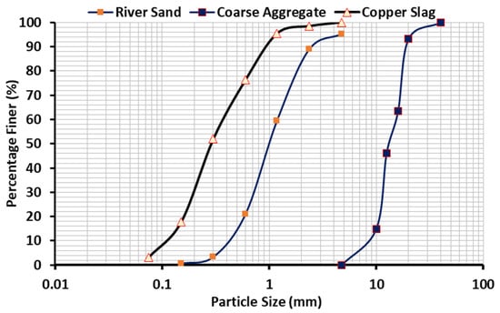 Blended aggregates (size: 20 and 10 mm) procured from the local quarry were used in this work. The density of coarse aggregate was found to be 2.74 g/cm3. Figure 4 depicts the particle-size distribution graph of the coarse aggregate compared with the river sand and copper slag. From Figure 4, it is clear that the coarse aggregates are also well-graded and show a smooth “S-curve” pattern in the particle-size distribution diagram.