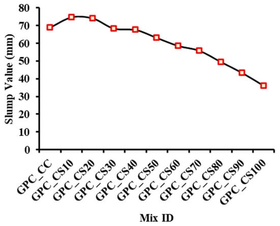 The reduction in the slump value is due to the physical characteristics of the material used in the concrete and the amount of copper slag present in the mix. Due to the replacement of the copper slag up to 100%, the density of the concrete increases up to 2632 kg/m3. The copper slag addition resulted in an increase in density of 9.3% when compared to the conventional GPC without copper slag. When the copper slag was replaced more than 50%, the GPC mix becomes much stiffer and is harder to fill-in and compact in the molds as a result of which the workability was considerably reduced. Also, the workability reduction could also be due to the increase in the density of the GPC mix when the copper slag was added at a higher volume. Moreover, the reduced slump value may be due to the higher viscosity of the alkaline liquid used in the concrete mix, as no additional water is added during the mixing to achieve better compressive strength.