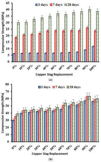 Compressive strength of copper slag-based HSGPC. (a) Ambient-cured specimens. (b) Steam-cured specimens.