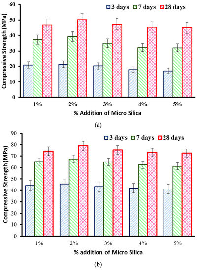 Figure 7 shows the compressive strength of the specimens subjected to ambient- and steam-curing conditions and tested at different ages. From Figure 7, it is clear that the compressive strength of the GPC was found to increase until the addition of 2% micro silica. Micro silica being a pozzolanic material results in a more uniform mix along with the reduction in pore size of the binder paste. However, the addition of more than 2% micro silica in the GPC could result in handling difficulties and the poor distribution of micro silica particles. For the addition of 2% micro silica, the compressive strength of the optimized GPC mix increased by 38.7 and 31.8% for the ambient and steam specimens, respectively. The addition of more than 2% micro silica resulted in a marginal reduction in the compressive strength of the GPC specimens under both ambient- and steam-curing conditions. This is due to the fact that the addition of a higher dosage of micro silica could hinder the geopolymerization process and creates a demand for Na2O in the alkaline activator [34]. This in turn could result in the reduction in strength. For the addition of 5% micro silica, the increase in compressive strength achieved was 16.1 and 21.1% for the ambient- and steam-curing conditions, respectively.