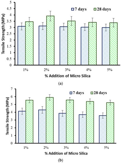 The splitting tensile strength test is conducted in accordance with IS 5816-1999 [77]. Figure 8 shows the tensile strength obtained at ambient- and steam-curing conditions and tested at different ages. Similar to the compressive strength, the values of the splitting tensile strength were found to increase with the increase in micro silica until 2%. For the addition of 2% micro silica, the splitting tensile strength of the optimized GPC mix increased by 12.9 and 6.24% for the ambient and steam specimens, respectively, when compared to the HSGPC with 1% micro silica. Adding a larger dose of micro silica to the alkaline activator might impede the geopolymerization process and increase the need for Na2O. For the addition of 5% micro silica, the splitting tensile strength of the HSGPC was even less than the specimens with 1% micro silica.