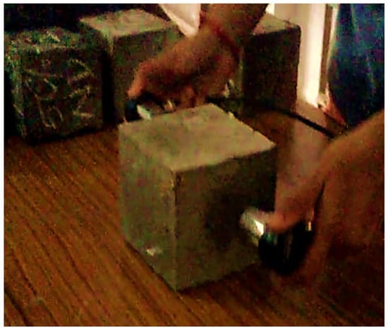 In this study, the ultrasonic pulse velocity (UPV) test, which is a non-destructive evaluation method, was used to understand the quality of high-strength geopolymer concrete. The quality of copper slag-based HSGPC is evaluated in terms of its material homogeneity, the presence of internal flaws and cracks, etc. The ultrasonic pulse velocity test was conducted as specified by Indian Standards [56]. As shown in Figure 9, the test was performed on the high-strength geopolymer concrete cubes of size 100 mm and tested at the 28-day age of the ambient- and steam-curing methods. From the inference of the UPV results, the quality of concrete can be classified under four different categories: (a) Excellent (v > 4.5 km/s), (b) Good (3.5 km/s < v < 4.5 km/s), (c) Medium (3.0 km/s < v < 3.5 km/s) and (d) Doubtful (v < 3.0 km/s).