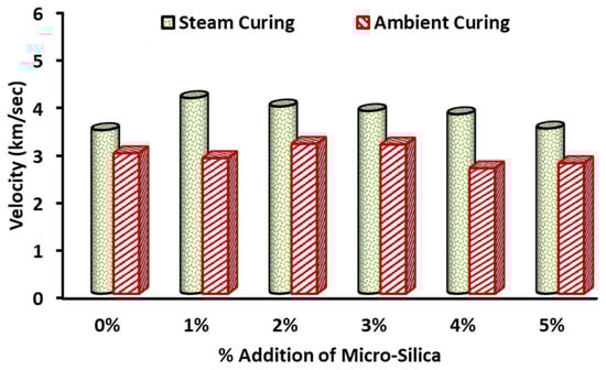 From Figure 10, it can be observed that the velocity for all the cubes was in the range of 3.65 to 3.89 km/s. The pulse velocity obtained for the HSGPC specimens with 100% copper slag (optimized mix) was observed as 3.65 and 3.70 km/s for the ambient-curing and steam-cured specimens, respectively. The quality of the high-strength geopolymer concrete with different copper slag dosages can be brought up under the quality category “Good”. However, the addition of micro silica reduced the pulse velocity of the high-strength geopolymer concrete. With the addition of 5% micro silica, the pulse velocity showed a significant reduction of about 15.7% due to the porous nature of the geopolymer concrete cured under ambient conditions. The value of the pulse velocity for the 5% micro silica specimen was 3.46 km/s and was categorized under the concrete quality of “Medium”. From the overall UPV results, it can be concluded that the ambient-cured specimen had a lower velocity due to the presence of gel water formed during the geopolymerization process. This variation in pulse velocity is due to the presence of water in the form of a gel.