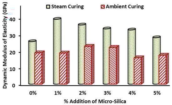 Figure 11 shows the comparison of the dynamic modulus of elasticity and the percentage addition of micro silica. From the results observed, it is clear that the value of Ed reduces with the increase in the micro silica addition similar to the trend of the pulse velocity. The range of the values of the dynamic elastic modulus for both the ambient- and steam-curing conditions were found to be from 20 to 40 GPa.