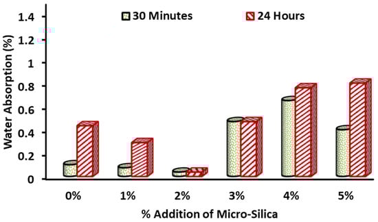 The values obtained for different dosages of micro silica are shown in Figure 12. The water absorption of the high-strength geopolymer concrete up to 2% is very low and it increases in further percentages. The water absorption for concrete with higher dosages of micro silica is more when compared to concrete with micro silica less than 2%. Nevertheless, the water absorption values for all the test specimens were found to be less than 1%. Hence, the addition of low levels of micro silica is found desirable as it decreases the total pore volume present in the HSGPC mix and thereby reduces the water absorption [34].