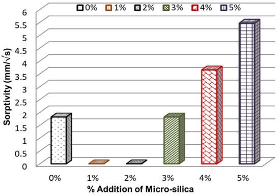 For ensuring a unidirectional flow of water through the cube specimen, sealants were used on all sides other than the exposure face. The exterior surface of the test specimen is prevented by sealing with the use of a non-absorbent coating such as paint, epoxy, etc. The specimens are coated with paint on three sides and the bottom surface exposed to water for about 30 min. For every 30 min, the samples were taken out and weighed to determine the water absorption of the specimen. The test is continued for 6 h. As shown in Equations (3) and (4), the cumulative water absorption per unit area of the inflow surface increases as the square root of elapsed time (t). The sorptivity values of all the specimens with micro silica are found to be less than 6 mm (Figure 13). Hence, it can be conferred that the prepared GPC mixes are of good quality and possess excellent durability resistance characteristics.