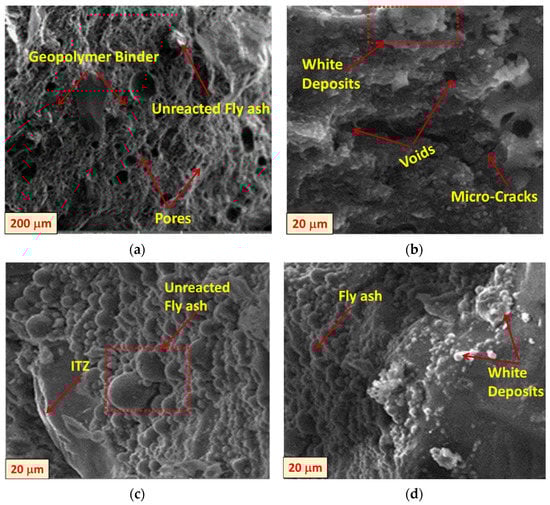 - The microstructural analysis of the HSGPC specimens revealed the presence of characteristics, such as white deposits, pores, micro-cracks, Na-Al-Si-H gel and ITZ formation. Moreover, a number of unreacted fly ash particles were witnessed in the case of the ambient-cured GPC specimens due to the insufficient heat generally required to initiate the polymerization reaction.