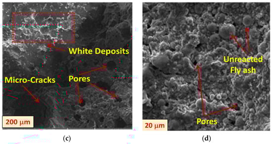 Silica fume (SF), which is a by-product from the smelting process of silicon and the ferrosilicon industry, can be obtained during the carbo-thermic reduction of highly pure quartz. It is characterized by the presence of a micro sphere of non-crystalline silica, having a mean size of 0.1–0.3 μm with an excessive surface area [27,28,29]. Hence, the addition of micro silica as an alternate cementing material enhances the load and durability resistance of concrete due to their better pozzolanic reactivity. Hence, the mechanical properties of the developed mix are improved by offering the active SiO2 for the geopolymerization process and the structure is made denser [30,31,32]. Das et al. [29] researched the microstructural and strength characteristics of micro silica and lime-based GPC under ambient-curing conditions. They justified that the replacement of fly ash with lime resulted in reduced workability and initial setting time. However, the compressive strength and microstructural properties of concrete were enhanced when used in combination with the silica fume. Adak et al. [33] studied the behavior of GPC manufactured using the nano-silica. They showed that the nano-silica addition helped in enhancing the polymerization of geopolymers even in ambient conditions. Okoye et al. [34] studied the durability characteristics of geopolymer concrete made with micro silica and low-calcium fly ash. They found that the presence of 20% silica fume showed no real signs of deterioration under 90 days of 2% H2SO4 solution and 5% NaCl treatment when compared to the conventional cement-based concrete.