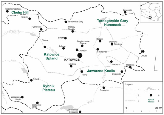 The location of the study area (south Poland), ([26]—modified): 1—state border, 2—border of the Silesian Upland, 3—minor geographical borders [28], 4—rivers and lakes, 5—towns and cities, 6—the name of physical and geographical regions.
