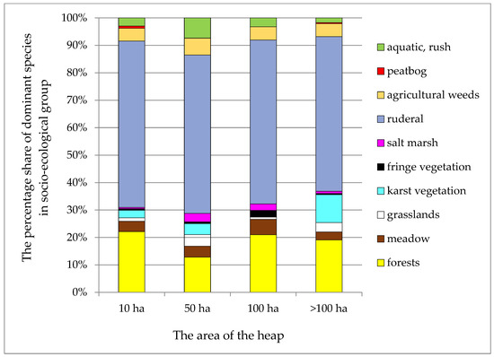 The percentage share of dominant species in socio-ecological groups in relation to the area of the heap.