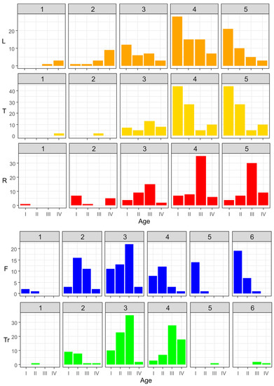 The participation of rare, endangered, and protected species recorded on post-coal mining heaps in relation to the values (1–6) of selected ecological indicators (L—light, T—temperature, R—soil reaction, F—moisture, and Tr—trophy) and the age class of the heap (I–IV) they were found on.