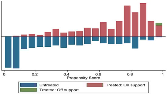 The estimated PSM technique distribution by treatment and common support area. “Untreated” denotes the non-adopters group; “Treated: on support” denotes the individual observations of the adoption group, revealing the corresponding match in the non-adopted group; “Treated: off-support” denotes the individual observation of the adoption group. No corresponding matches were shown in the non-adopted group.