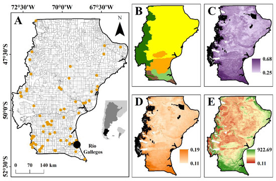 Study area. (A) Location of Argentina (dark grey), Santa Cruz (black), Rio Gallegos (black point), and sample sites (orange); (B) main ecological areas (dark green = Andean Region, brown = Humid Magellanic Steppe, green = Dry Magellanic Steppe, orange = Mata Negra Thicket, and yellow = Central Plateau; (C) lamb yield (g lamb/m2/year); high production = dark violet and low production = light violet (Peri et al. 2021); (D) wool yield (g greasy wool/m2/year); high production = dark orange and low production = light orange (Peri et al. [24]); (E) net primary productivity (g C/m2/year); high net primary productivity = green, and low net primary productivity = red [32]. Black areas represent NDVI < 0.05, elevation > 1200 m.a.s.l., Nothofagus pumilio, mixed evergreen forests, and natural protected networking areas where there are no livestock.