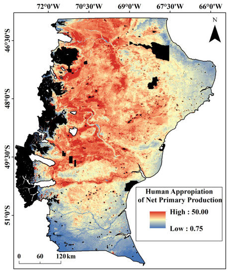 In the present work, livestock production (lamb and wool) accounted for a mean regional value of 11.35% of appropriated NPP. We found that HANPP distribution across our study region aligned well with the range of global means HANPP estimated to be 15.6 Pg C/year, or 23.8% of NPP; 53% was attributed to the harvest of food and fiber; 40% to land-use-induced productivity changes, and 7% to human-induced fires [13]. This is consistent with previous research that highlighted several human-related activities in Southern Patagonia (e.g., livestock) negatively influenced the original ecosystems by modifying the plant biodiversity, soil properties, and structure [27,32,40]. The agricultural sector dominates global HANPP estimates, consisting of 84–86% of global NPP appropriated, 42–46% due to conversion to cropland, and 29–33% to grazing [34].
