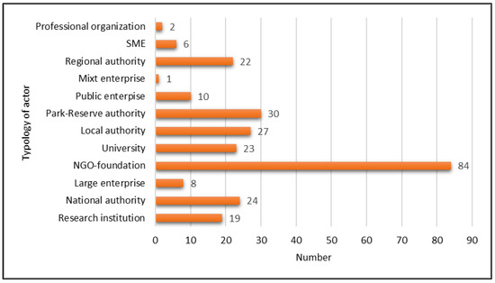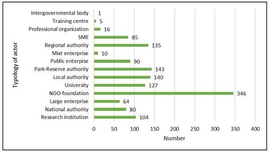 Detailed information for each project actor included its country, level of governance (i.e., international, national, regional, provincial, and municipal), and the type of actor. From civil society to local authorities, the LIFE Regulation (Art. 3) does not exclude any type of organization for the selection and co-financing of a project initiative [62]. Types of beneficiaries refer to the taxonomy proposed by the database of LIFE projects, which includes different categories of actors located in public, private, or public–private spheres [54]. Specifically, the following categories were utilized in this study: international enterprise, large enterprise, mixed enterprise, small and medium-sized enterprise (SME), public enterprise, non-governmental organization–foundation, national authority, regional authority, local authority, park–reserve authority, professional organization, research institute, university, and educational centre.