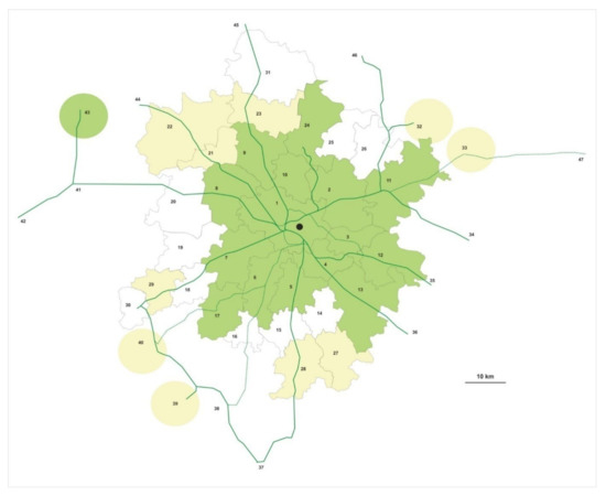The employees of WUST lived in Wrocław and in surrounding areas. We considered the specific territorial units (called the analyzed territorial unit (ATU)) that were the municipalities in general. In two cases (ATUs no. 11 and 13), there were two municipalities each (separated by the city and villages). First, we considered Wrocław (ATU no. 1) and 31 closely located ATUs creating the agglomeration. Next, we added 16 other areas outside the agglomeration connected with Wrocław (a comprehensive survey from 2018 identified the journeys between these areas). All of the units were presented in Figure 1. We divided the units into three groups: ATUs with significant numbers of questionnaires (more than 3) were marked with green markings, ATUs with fewer numbers of journeys with yellow markings, and ATUs with no journeys to WUST with no markings. In the next analysis, we considered only 16 ATUs with numbers of journeys higher then 3 (the green ones). Figure 1 contained the main rail network too, considering the used lines (solid green line) and not used for passenger transport in the year 2021 (dotted green line).
