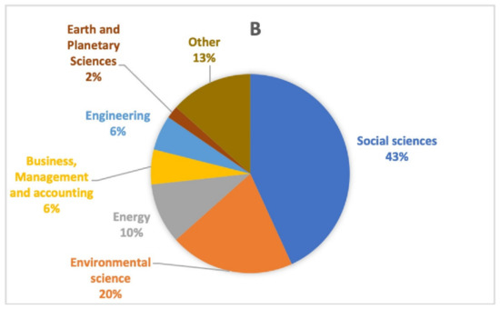 Results of a Scopus search on 10 December 2021. Using in “Title, abstract and keywords” the SDG-related terms “SDGs” OR “2030 Agenda” OR “Sustainable Development Goals” OR “Global Goals”. The subject area “Earth and Planetary Sciences” covers only 4% (A). Using instead “Education for Sustainability” OR “Education for Sustainable Development” the percentage of the area decreases to 2% (B).