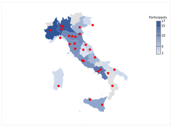 Thanks to the third question (“In which university do you study/work?”), it was possible to understand the academic background of the questionnaire participants. The answers showed that the participants came from 26 different Italian universities (Figure 3). In addition, three of the answers referred to three foreign universities (Royal Holloway—UK, Universidad de Salamanca—Spain, Tongji University—China).