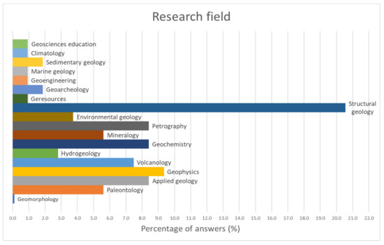 With regard to the participants’ fields of study/research, it was possible to identify 18 areas (Figure 4). Among these, the prevailing one was structural geology (20.6%).