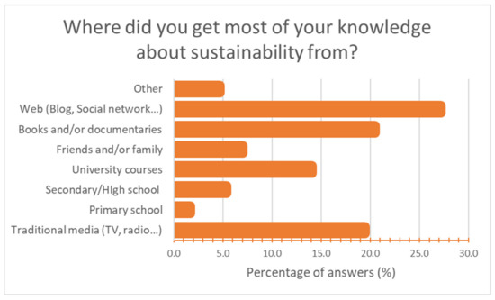 To better investigate the variety of the sources of their knowledge, the following question (“Where does your knowledge about sustainability come from?”) allowed a multiple choice. Innovative sources (social networks, blogs, websites, 73.6%) and traditional ones (TV, radio, newspapers 52.7%; books and documentaries 55.5%) seem to be the principal information channels. Schools clearly have had a secondary role in their education for sustainability (Figure 6).