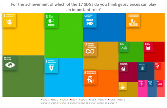 Finally, the 17 SDGs have been listed, with respondents being asked to select those SDGs in which the geosciences can play an important role (multiple choice was allowed). As shown in Figure 10, four of the SDGs were the most selected ones; these were goal 7 (affordable and clean energy, 73.8%); goal 13 (climate action, 72%); goal 15 (life on land, 72%) and goal 6 (clean water and sanitation, 61.7%). Among those less chosen, we have goals 5 (gender equality, 7.5%), 10 (reduce inequalities, 6.5%), 16 (peace, justice and strong institutions) and 1 (no poverty, 5.6%).
