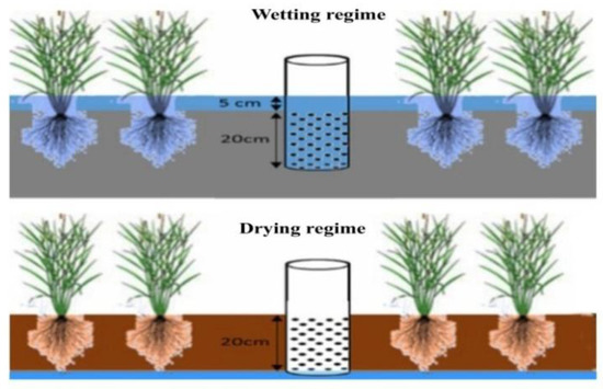 Four seedlings with 15 cm plant spacing were transplanted in a single pot, and further 3–5 cm ponding water depth was retained for the seedlings’ establishment for 15 days. Moreover, in the individual AWD treated pots, a perforated PVC pipe was inserted up to 20 cm below the soil surface to monitor the water levels in the soil. In the AWD pots, the soil is allowed to dry until the water levels reach 15 cm from the surface, and after that, the pots were flooded to 5 cm above the soil surface (Figure 1). This periodical drying cycle continued to the whole growth period, except in the flowering stage. In the continuously flooded irrigation pots, water levels were kept above 3–5 cm from the soil surface during the whole growth period of the rice. Other intercultural operations such as weeding and spraying pesticides were performed when necessary. At maturity, rice was harvested after 98 days of transplanting.