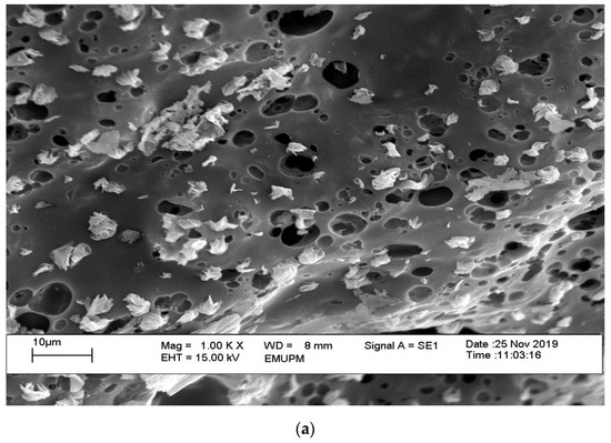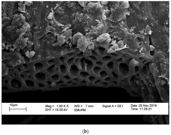 Micrograph of RHB and EFBB at 1000× magnification by SEM. (a) Rice husk biochar (RHB), (b) Oil palm empty fruit bunch biochar (EFBB).