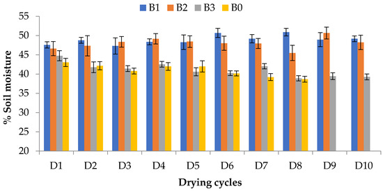 The soil moisture percentage was significantly (p < 0.05) influenced by the inclusion of combined RHB and EFBB with 15N urea treatments (Figure 3) at different drying cycles (D) of AWD. From the first drying cycle (D1), it was observed that B1, B2, B3 and B0 showed very near values (47.56%, 46.59%, 44.75% and 43.02%, respectively). Nevertheless, in the subsequent drying cycles of AWD, the biochar treatments (B1 and B2) presented significantly greater moisture contents over B3 and B0. The biochar treatments B1 and B2 showed adjacent value in most drying cycles except in D8. Similarly, B3 and B0 also exhibited somewhat similar soil moisture values from D1 to D8, but profound variation was only found in D7. Overall, the total number of drying cycles (10) were similar for B1, B2 and B3, while 8 drying cycles were found in B0. However, B1 and B2 remarkably boosted soil moisture content compared to B3 and control B0 at various drying cycles of AWD irrigation.