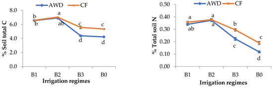 Regarding the total carbon content in the soil (Figure 4), the biochar treatment B2 exhibited greater under both AWD and CF irrigation (6.92% and 7.04%, respectively) followed by B1 (6.55% and 6.60%, respectively). Whereas, profoundly decreased results were observed from B3 and B0 in both irrigations. Considering the same biochar treatment, B3 and B0 with AWD regime exhibited reduced soil carbon (4.38% and 4.23%, respectively) compared to CF irrigation (5.58 and 5.36, respectively).