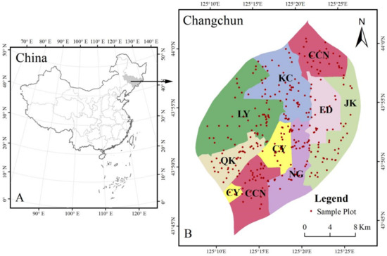 In this study, stratified random sampling method was used to determine and allocate the number of sample plots. The number of sample plots in the Kuancheng district (KC); Lvyuan district (LY); Nanguan district (NG); Chaoyang district (CY); Erdao district (ED); Jingkai district (JK); Changchun New district (CCN); and Qikai district (QK) were 53, 30, 16, 54, 36, 53, 51, and 38, respectively (Figure 1). The size of each plot was 20 m × 20 m, and the species’ names of woody plants and the number of each species in each plot were recorded.