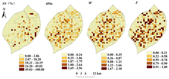 Spatial distribution of alien species, dMa, H′, and J at 1 km net level.
