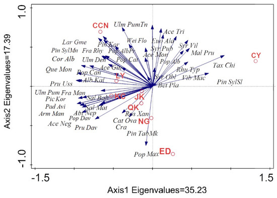 The PCA results showed that the first and second axes accounted for 52.62% of the total variances (Figure 3). The woody plant species distribution was highly heterogeneous among different administrative districts, and more species dwelt in the QK, CCN, LY, KC, and NG districts than in JK, LY, and ED districts. (Figure 3). The QK district had the highest species richness with 61 species, followed by the CCN, LY, and KC districts with 58, 58, and 57 species, respectively. Moreover, the ED district had the lowest species richness with only 30 species. Among the 50% best fitted species (Figure 3), the richness of Sal Mat, Pad Rac, Sal Bab, Arm Man, Pop Dav, Ace Neg, Amy Day, and Cat Ova in KC district were higher than those in other districts. The richness of Ulm Pum, Pic Asp, Pru Uss, Alb Kal, Que Mon, Pyr Uss, Pru Cer, Lig Qui, Swi Alb, Pop Alb, Pin Syl, Fra Rhy, Pin Kor, Mal Pum, Ace Bue, Ulm Pum, Jap Map, Syr Pub, Syr Vil, and Car Arb were the highest in the CCN district. The richness of Gle Sin, Tax Chi, Amo cru, Lar Olg, Sab chi, Pin Syl Sl, and Ace Tru were higher in the CY district than in other districts (Figure 3). Moreover, the richness of Pop Max in the ED district is higher than in other districts (Figure 3).