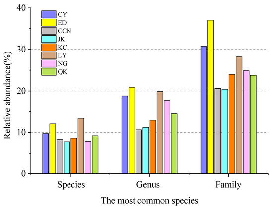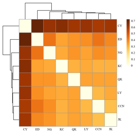 The SIMPER analysis among different administrative districts showed that species distribution in the CY district had higher dissimilarity with other districts, with the value basically close to or above 60%, and its clustering distance was the biggest compared to other districts. Among them, the species in CY district had the highest dissimilarity with ED district, with a dissimilarity ratio of 73%. Sal mat, Tax chi, Pop max, Mal pru, Pop dav, and Amy dav contributed to about 23% of this result. Except for the CY district, species dissimilarities between all other districts were lower than 45%. The species dissimilarity between the JK and CCN districts was the lowest, only about 29.17% (Figure 4), and that between the CCN and LY districts was also lower with the value of 29.67%. Among them, the CCN and JK districts were both newly built urban districts, and the species, such as Fra man, Pru tri, Lon maa, Fra rhy, and Ulm den, contributed greatly to this result.