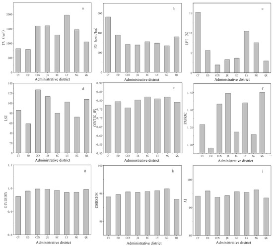 Landscape indices of different administrative districts in Changchun. (a) Total Area (TA) of different districts, (b) Patch Density (PD) of different districts, (c) Largest Patch Index (LPI) of different districts, (d) Mean Shape Index (LSI) of different districts, (e) Contiguity Index Distribution (CONTIG-MN) of different districts, (f) Perimeter-Area Fractal Dimension Index (PAFRAC) of different districts, (g) Landscape Division Index (DIVISION) of different districts, (h) Patch Cohesion Index (COHESION) of different districts, (i) and Aggregation Index (AI) of different districts.
