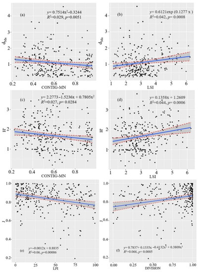 Correlation between species diversity attributes and landscape pattern indices. (a) correlation between dMa and CONTIG-MN; (b) correlation between dMa and LSI; (c) correlation between H′ and CONTIG-MN; (d) correlation between H′ and LSI; (e) correlation between J and LPI; (f) correlation between J and DIVISION.