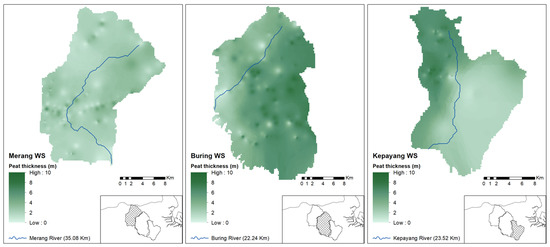 The spatial distributions of peat thickness in Merang, Buring, and Kepahyang are shown as in Figure 2.