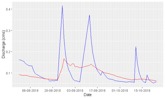 Model validation at Pal 7, using observation discharge (red line) and simulation discharge (blue line).