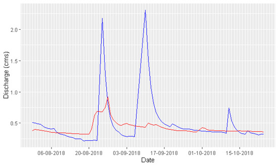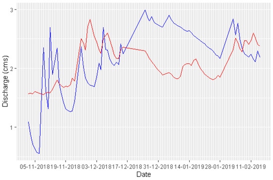 The daily discharge measurement and discharge simulation at Pal 3 and Pal 7 are shown in Figure 4 and Figure 5.