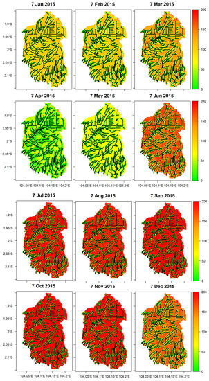 The study area consists of three sub-basins, namely: (i) Buring, (ii) Kepahyang, and (iii) Merang. Further analysis showed that the results were similar in the three sub-basins. Since sub-basin Buring is the largest among the three and its position is in the middle, the results and analyses of Peatland Fire Danger Index will be focused on sub-basin Buring. The spatial-temporal evolution of fire hazard in Buring is presented in Figure 7. Figure 7 (January–June 2015) explains the distribution of fire hazard before the El Niño event. The figure shows that locations close to the canal network showed a lower hazard than distant ones. This evidence revealed that horizontal drainage flux occurred toward the canal, leading to groundwater drawdown. More water was expected close to canal networks. For instance, on 7 June 2015, where a high hazard occurred in 41% area, there was 35% area surrounding the canals with low hazards (green color). A similar phenomenon also was found in the period of July–December 2015, when El Niño struck (Figure 7).