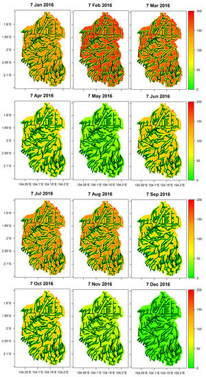 The required data have different spatial resolutions. We argue that the resolutions of the climate data used in this study were appropriate, as the location is relatively flat topographically. Therefore, the spatial variability in the temperature data in this location was relatively small. The years of 2015 and 2016 were chosen as study cases to explore the possible condition of extreme hazard, which could occur in the basin. A strong El Niño was represented by 2015, whereas La Nina climate occurred in 2016 [26,27]. However, the run of the SWAT model started in 2013, using 2-year warming periods.