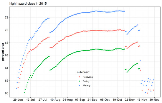 Then, the fire hazard was verified with hotspot data. All hotspots only coincided with the high hazard when it attained more than 60% area of the basin (Figure 11). No hotspot data were reported on low/moderate levels throughout 2015/2016. The larger the area with high mKBDI, the more the frequency of hotspots rose substantially. Sixty-three hotspots occurred during August–October 2015 when the high hazard area was above 70%.